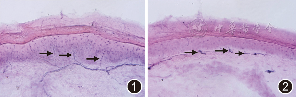 计数表皮内神经纤维时,以每根从真皮神经丛发出穿过基底膜进入表皮的神经计数为1根[2]。表皮层长度使用Image Pro Plus 6.0测量(Media Cybernetics, Silver Spring, MD),由此可计算出表皮内神经纤维密度(根/mm)。IENFD低于国际标准参考值第5百分位数时被认为异常[10]。所有标本由对患者临床资料不知情的同一人计数和测量。