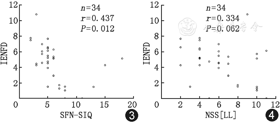 其中IENFD与SFN-SIQ偏相关系数r=0.437,P=0.012,差异有统计学意义,两者呈中度相关(图3);IENFD与NSS[LL]偏相关系数r=0.334,P=0.062,两者呈边缘相关(图4);IENFD与其他量表评分无相关性。