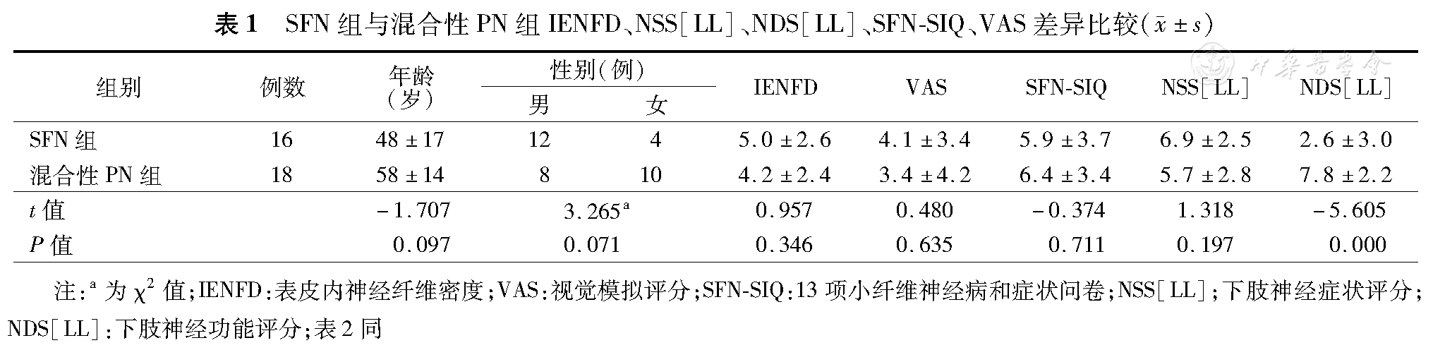 混合性PN组IENFD略低于SFN组,差异无统计学意义;混合性PN组NDS[LL]评分明显高于SFN组,P<0.001差异有统计学意义(表1)。