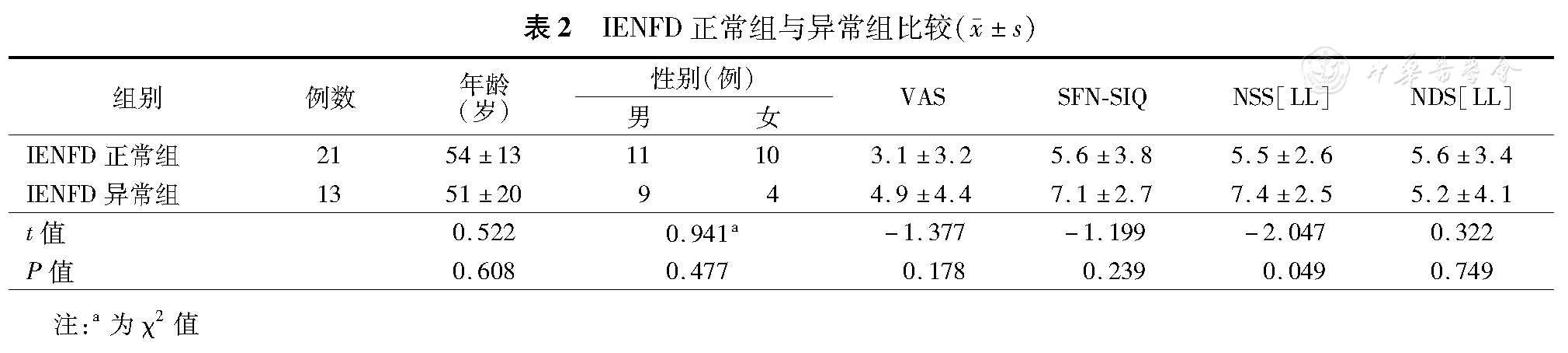 | IENFD正常组 | 21 | 54±13 | 11 | 10 | 3.1±3.2 | 5.6±3.8 | 5.5±2.6 | 5.6±3.4 | |