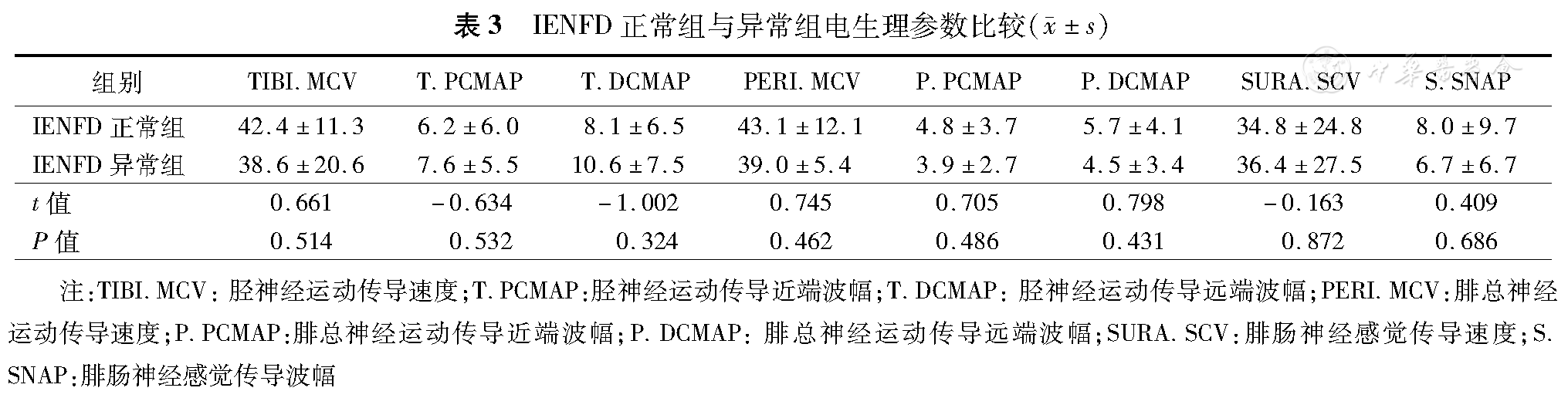 IENFD正常组中,10例仅有小纤维症状,11例(52.4%)有大纤维症状;IENFD异常组中,6例仅有小纤维症状;7例(53.8%)有大纤维症状。IENFD异常组NSS[LL]评分明显高于正常组,P=0.049差异有统计学意义(表2)。IENFD与各项电生理参数差异均无统计学意义(表3)。