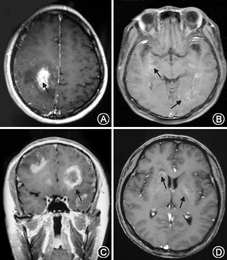 单纯脑干受累的TDL 2例,大脑半球受累56例。病变单侧受累24例(41.3%),双侧受累34例(58.7%);单发病灶22例(37.9%),多发病灶36例(62.1%)。TDL急性期以斑片样或结节样强化为主(图1A),[在超急性期或急性早期(≤7~10 d)增强扫描仅见线状或小片状强化(图1B)];亚急性期以周边强化明显为特点,呈现出环形或"C"形强化(图1C),但有时因其处于炎症反应的不同阶段或病灶大小的不同,其影像学表现不尽相同,也可呈现出急性期的斑片样或结节样强化;慢性期病灶呈轻度线性、小片状环形浅淡强化(图1D),部分病灶强化消退。