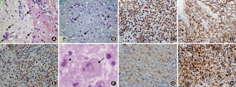 急性期可见大量的吞噬细胞及炎细胞浸润,主要以淋巴细胞(CD3、CD4、CD8)为主,并多见淋巴细胞套袖形成,仅见散在少量浆细胞,可见肥胖型星形胶质细胞(图2)。
