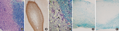 慢性期病灶与周围组织界限清楚,吞噬了髓鞘的吞噬细胞主要集中在病灶边缘,其细胞数较急性期减少,且处于非活动期,纤维型星形胶质细胞增多,可见浆细胞(CD79a、CD38、CD138)浸润,髓鞘再生逐渐形成(图3)。