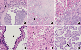 微乳头结构被公认为是任何部位腺癌中预后差的一种表现或组织学类型。与肿瘤的脉管侵犯、淋巴结转移和存活时间缩短2~5年有关[19]。其特点是小乳头状肿瘤细胞簇漂浮在边界清楚的、类似淋巴管腔的间隙内,结构具有反极性(即肿瘤细胞基底或间质面朝向外侧)[20]。对于PTC微乳头结构的定义,有文献在上述特点的基础上增加了:乳头结构无纤维血管轴心,未见鞋钉结构;具有微乳头结构的细胞所占比例>5%[21]。而文章结果显示此类型预后极差,死亡率及LNM率高,但病例罕见(7/496),平时很难遇到,对于LNM常见的肿瘤来说,此标准对预测LNM的临床意义不大。其他文献则定义PTC微乳头结构为小的乳头状结构伴或不伴有纤维血管轴心[5,11,15]。因此本研究采纳后者,并增加乳头直径大小限定。结果显示伴有纤维血管轴心的微乳头结构多见,常与LOCP相伴出现,提示其形成机制可能与LOCP及EMT有关;无纤维血管轴心的微乳头结构少见,多位于肿瘤边界。目前认为微乳头结构的反极性,与基底面获得顶浆分泌功能有关,并被电镜所证实(在肿瘤基底面出现大量微绒毛)[22]。推测这些反极性可促进肿瘤细胞分泌有关间质血管浸润的相关分子(即金属蛋白酶类),从而促进肿瘤的播散。另外,与LOCP不同,反极性的癌细胞间表达E-钙黏附蛋白和细胞黏附因子,但同时也表达波形蛋白[23],推测其形成机制与LOCP同样,可能都与EMT有关,明确机制还有待于进一步研究与证实。