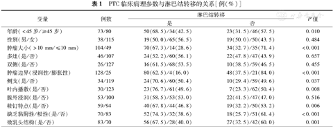 PTC临床病理参数与淋巴结转移的关系[例(%)]