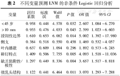 单因素分析中有意义的变量纳入二项分类成组资料非条件Logistic回归模型进行多因素分析,分析显示LNM的独立性相关危险因子为:年龄<45岁、肿物直径>10 mm、浸润性边界、鞋钉特点、LOCP、微乳头结构(P<0.05)(表2)。