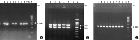 67株鲍曼不动杆菌中,adeB基因检出率为88.06%(59/67),adeJ、abeM基因的检出率为100%,所有替加环素耐药菌株均可检出adeB基因条带,即adeB、adeJ、abeM基因均阳性的替加环素耐药株共15株、敏感株共44株。adeB、adeJ、abeM基因部分PCR结果见图1,图2,其扩增阳性PCR产物部分经测序比对证实。