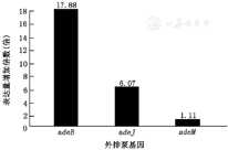 应用real time RT–PCR法检测15株替加环素耐药菌及10株敏感株(adeB、adeJ、abeM基因均阳性)外排泵基因表达情况(每个样本3个复孔)。目的基因与内参基因的扩增动力学曲线呈S型光滑扩增曲线,指数增长期明显;其融解曲线只有单峰值,反应具有很好的特异性。反应结束即可得到各个待测标本的基因循环阈值CT值。耐药株及敏感株adeB、adeJ、abeM基因表达量差异采用比较CT值法(2–ΔΔCT法),计算公式:①改变的倍数=2–ΔΔCT,②ΔCT=(CT靶基因–CT内参),ΔΔCT=ΔCT耐药株组–ΔCT敏感株组。结果显示(图4),替加环素耐药菌株adeB基因和adeJ基因的表达量平均较敏感菌株分别增加了17.88倍与6.07倍,而abeM基因的表达量无明显增加(1.11倍)。