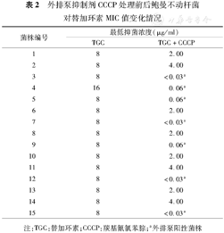 外排泵抑制剂CCCP处理前后鲍曼不动杆菌对替加环素MIC值变化情况