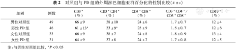 对照组与PD组的外周淋巴细胞亚群百分比的性别比较(