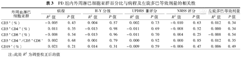 对所有PD患者外周血T、B淋巴细胞亚群的百分比进行系统分析,发现其与病程、病情严重程度及左旋多巴等效剂量均无显著性相关(P>0.05)(表3)。