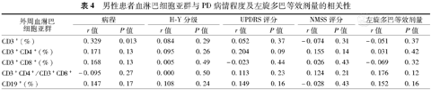 男性患者血淋巴细胞亚群与PD病情程度及左旋多巴等效剂量的相关性