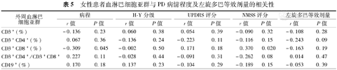 | 外周血淋巴细胞亚群 | 病程 | H-Y分级 | UPDRS Ⅲ评分 | NMSS评分 | 左旋多巴等效剂量 | |||||