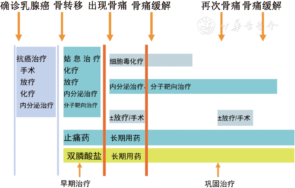 乳腺癌骨转移综合治疗的主要目标:(1)预防和治疗SREs;(2)缓解疼痛;(3)恢复功能,改善生活质量;(4)控制肿瘤进展,延长生存期。
