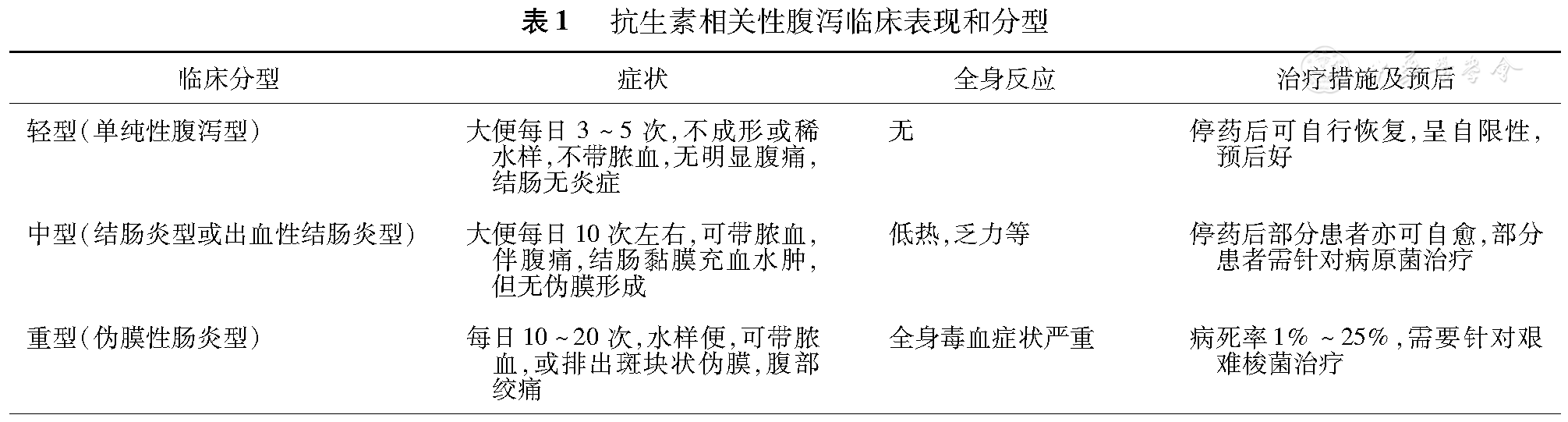 多种因素可影响AAD发生,如住院时间长短、抗生素种类、剂型、给药途径、使用人群等。根据临床表现AAD可分为轻中重三型(表1)。抗生素引起腹泻的原因和机制主要有以下几点:(1)肠道正常菌群结构破坏:一方面可使肠道菌群相关的糖类代谢降低,引起渗透性腹泻;另一方面使肠道生物学屏障破坏,病原微生物异常定植并产生毒素,引起炎症反应导致腹泻;(2)肠道动力改变:有些抗生素如红霉素,可直接激动胃动素受体,使胃肠蠕动加快引起腹泻;(3)肠黏膜损害:氨基糖苷类抗生素毒性作用可直接损害肠道黏膜,使肠道营养物质吸收不良或分泌增加。目前,AAD的确切机制尚不十分清楚,但抗生素引起肠道菌群失调继发病原微生物异常定植被认为是最主要的发病机制[2]。多种病原微生物如细菌、真菌和病毒均可参与AAD发病,常见的病原菌包括金黄色葡萄球菌、艰难梭菌、克雷伯菌、沙门菌等。