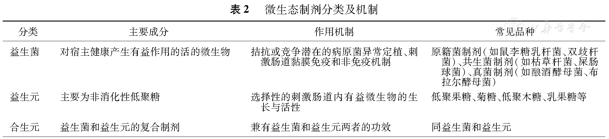 微生态制剂是指根据微生态学原理,利用对宿主有益的正常微生物或其促进物制备的制剂,具有直接补充或促进宿主有益微生物生长,维持或调节微生态平衡的作用[5]。微生态制剂包括益生菌、益生元和合生元三种(表2)。