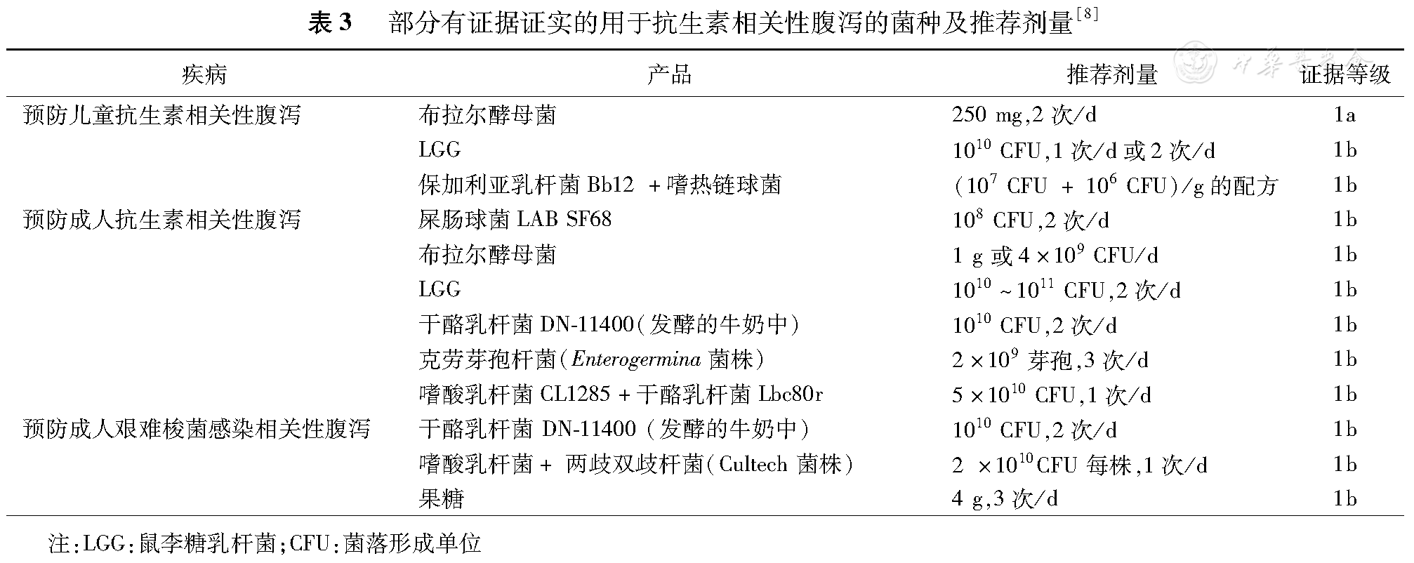 对于其他单一或混合的多种益生菌制剂,虽亦有研究显示其在AAD的防治中有一定疗效,但这些研究多为小样本研究且缺乏重复性,临床证据并不充分。世界胃肠组织公布的益生菌和益生元的相关指南中,列出部分有证据证实的用于AAD的菌种及推荐剂量(表3)[8]。