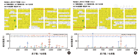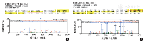 乳铁蛋白的理论相对分子质量为77 970.0,图3A和3B分别表示乳铁蛋白对照组和病例组的肽段匹配图(黄色区域为经质谱鉴定所得到的肽段)及红线标示肽段的原始质谱图。鉴定蛋白的相对定量值病例组为914,对照组为571,鉴定蛋白的相对定量比值(病例/对照)为1.60。乳铁蛋白在TAO患者泪液中的上调尽管没有溶菌酶C那么明显,但其上调的趋势是显而易见的。