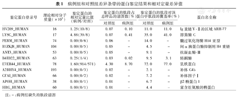 病例组和对照组差异条带的蛋白鉴定结果和相对定量差异值