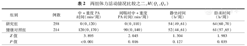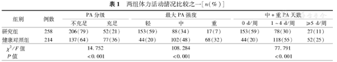 研究组体力活动充足者占20.1%(52/258),健康对照组为35.9%(77/214),差异有统计学意义,P<0.001。研究组最大体力活动强度高于对照组,中+重体力活动天数高于对照组,差异有统计学意义,均为P<0.001,见表1。研究组中+重体力活动时间、闲暇时中+重体力活动时间低于健康对照组,差异有统计学意义,均为P<0.001;卧床时间高于健康对照组,差异有统计学意义,P<0.05。见表2。