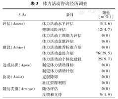基于5-As模型体力活动咨询中的13项内容,自制体力活动咨询经历调查表。通过临床晤谈,询问患者在就医过程中,是否接受了上述13项体力活动咨询内容,回答"是"者,记为"阳性"。