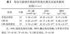 | 组别 | 只数 | 丙二醛(nmol/mg) | SOD(U/mg) | MPO(μU/mg) |