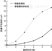 A组裸鼠种植后第7天,成瘤率7/7只,B组裸鼠种植后第5天,成瘤率5/5只;两组裸鼠成瘤后于接种部位均可见一个白色小结节,质略硬,随着种植时间的延长,肿瘤体积逐渐增大,肿瘤表面出现溃烂,以移植瘤组织块组为明显;两组裸鼠右侧腋窝均未触及肿大淋巴结。实验结束前所有裸鼠无死亡、生长状态良好。用卡尺每周测量两组裸鼠肿瘤块的长径a、短径b,按公式V=4/3πab2统计肿瘤体积,两组原位肿瘤块体积差异有统计学意义(P=0.023),移植瘤组织块组肿瘤体积>细胞悬液组。第1~6周,细胞悬液组肿瘤体积每周分别为(0.010±0.003)、(0.254±0.020)、(0.962±0.032)、(1.848±0.290)、(3.561±0.942)、(6.578±1.341) cm3;移植瘤组织块组肿瘤体积每周分别为(0.141±0.038)、(1.663±0.813)、(5.379±2.490)、(10.795±4.994)、(13.751±5.541)、(15.442±6.927) cm3(图1)。