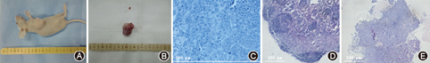 (1)A组裸鼠进行异氟烷吸入麻醉,四肢固定,选择裸鼠右侧第2对乳腺进行接种,手术区域用碘酒消毒,乳头旁切开一个4~5 mm切口,暴露乳腺脂肪垫,分别注射0.1 ml传代培养的MDA-MB-231细胞悬液(宁夏医科大学总医院医学实验中心提供)后缝合切口,细胞浓度为1×107个/0.1 ml。(2)A组裸鼠成瘤2周后,切取2只裸鼠的原位肿瘤,选择移植瘤新鲜鱼肉样组织,剪成直径2~3 mm的碎块,置于盛有PBS的器皿中,冰上放置,准备接种于B组裸鼠,其余5只A组裸鼠继续饲养。(3)B组裸鼠同样暴露乳腺脂肪垫,将准备好的移植瘤组织块分别种植于乳腺脂肪垫下,缝合切口,术后继续无菌饲养。(4)大体观察:观察接种区是否形成肿瘤,腋窝是否能触及肿大淋巴结,皮肤有无溃烂,裸鼠的活动状态及生长情况有无异常。(5)病理检查:两组裸鼠均于接种后第6周,解剖取得原位肿瘤和肿大淋巴结进行HE染色病理检查。