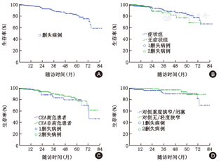 570例(去除在院期间死亡2例)患者中共有511例接受随诊,随访率为89.6%(511/570),随访时间1~86个月,平均42个月。其中9例(1.8%)患者死亡,原因为心肌梗死4例,脑梗死1例,肺栓塞1例,不明原因猝死2例,恶性肿瘤1例。发生心脏事件25例(4.9%),9例(1.8%)患者发生脑卒中,其中脑出血1例,5例为短暂性脑缺血发作(TIA),另3例为大面积脑梗死(表2)。术后1、2及5年免于主要并发症生存率分别为97.9%、92.7%及81.6%(图1A)。症状性颈动脉狭窄随访期内主要并发症(死亡/脑卒中/心脏事件)发生率为8.7%(23/263),无症状组为5.6%(14/248),差异无统计学意义(χ2=1.826,P=0.177)(图1B)。高危患者随访期主要并发症发生率为9.0%(12/134),非高危患者为7.2%(27/377),差异无统计学意义(χ2=0.451,P=0.502)(图1C)。合并对侧颈动脉重度狭窄或闭塞患者,随访期死亡/脑卒中发生率为7.4%(15/204),对侧颈动脉无狭窄或轻度狭窄患者发生率为1.6%(5/307),差异有统计学意义(χ2=10.679,P=0.001)(图1D)。CEA术后再狭窄17例(3.3%),7例为中度再狭窄(狭窄程度50%~70%),9例为重度再狭窄(狭窄程度70%~90%),1例完全闭塞。发生再狭窄患者中仅1例为翻转式切除术,其余16例均为传统切除术式,其中6例未使用补片。