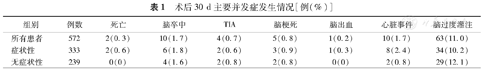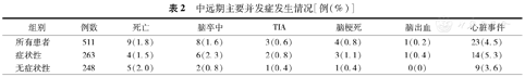 | 组别 | 例数 | 死亡 | 脑卒中 | TIA | 脑梗死 | 脑出血 | 心脏事件 | 脑过度灌注 |