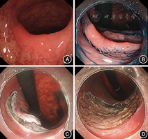 内镜直视下从直肠开始循腔进镜直到回盲部,必要时可进入回肠末段进行观察。退镜时依次从回盲部、升结肠、横结肠、降结肠、乙状结肠、直肠退出。退镜时依次全面观察,尤其是皱襞后及转折处,注意观察结肠黏膜的色泽、光滑度、血供情况等,必要时可反转镜身观察升结肠、直肠末段及肛门部,退镜时间应不少于6 min[60],如发现可疑病变则需确定病变的具体部位和范围,并详细在内镜报告中记录。检查过程中,如有黏液和气泡影响内镜视野可应用清水或祛泡剂及时冲洗。