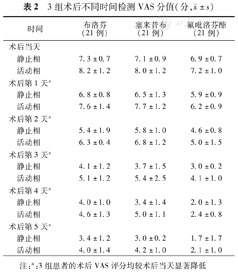 3组患者的疼痛均随术后时间明显减轻,从术后第1天开始与术后当天相比在3药物组中均显示明显不同,即3种非甾体药物均明显缓解术后疼痛,但在术后前3 d内,3组药物组间差异无统计学意义;术后第4天开始,氟吡洛芬酯组较布洛芬及塞来昔布组疼痛缓解程度较高(表2,表3)。