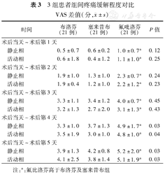 | 项目 | 布洛芬组(21例) | 塞来昔布组(21例) | 氟比洛芬组(21例) | P值 |