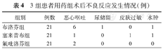 | 组别 | 例数 | 恶心呕吐 | 尿储留 | 皮肤过敏 | 水肿 |