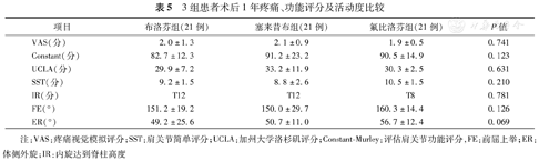 3组患者术后疼痛逐步缓解,术后第4天开始氟吡洛芬酯组疼痛评分明显低于另两组(第4天静止相P=0.03,活动相P=0.04;第5天静止相与活动相均P=0.03);药物不良反应发生率依次为布洛芬33.3%,塞来昔布14.3%,氟吡洛芬酯9.5%,3组间差异无统计学意义(P>0.05)。患者术前VAS平均7.2,肩关节简单评分(SST)为6.5,评估肩关节功能评分(Constant-Murley)为67.6,加州大学洛杉矶评分(UCLA)为17;前屈上举132.6°,外旋37.7°,内旋达L1水平;术后1年时VAS在布洛芬、塞来昔布及氟吡洛芬酯组依次为2.0、2.1、1.9;SST分别为9.2、8.5、10.5;Constant分别为82.7,91.2,90.5; UCLA分别为29.9、33.2、30.3;前屈上举3组分别为151.2°、150.0°、160.3°,外旋依次为49.2°、50.7°、56.7°;内旋分别为T12、T12及T8水平。疼痛、活动度及功能评分均较术前有明显改善,3组间差异无统计学意义(P>0.05)。