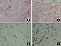 患者女,21岁,因体格检查发现左侧卵巢肿物7个月余入住南京大学医学院附属鼓楼医院。患者于2014年7月彩超探及左附件区稍强回声团块,大小68 mm×50 mm×19 mm,考虑畸胎瘤可能。血CA125等肿瘤标志物均正常。既往月经规则。体格检查:腹部平软,无压痛、反跳痛和肌紧张,腹水征(–)。妇科检查:外阴未婚式,子宫中位、正常大小。右侧附件区未见明显异常;左侧附件区触及6 cm×5 cm肿块,活动好,无压痛。术前诊断:左侧卵巢肿物性质待查。患者于2015年2月4日全麻下行经腹腔镜卵巢肿物剥除术。术中见子宫、右侧卵巢及双侧输卵管未见异常;左附件区囊性增大(6 cm×5 cm×5 cm),表面光滑、呈蓝紫色,囊肿与周围膜状粘连,切除后送病理学检查,术后恢复良好。大体检查:灰红色破碎组织一堆,共大小6 cm×6 cm×3 cm,切面暗红灰白色,部分区呈海绵状、蜂窝状改变。显微镜下:送检肿块由大片分化成熟的扩张的薄壁血管构成,管腔大小不一,互相吻合(图1),部分管腔内充满红细胞,并可见血栓,部分区管腔间可见少许异型不明显的梭形细胞及管壁胶原化。管腔内壁被覆单层扁平内皮细胞,细胞无异型性(图2)。送检组织内见少量卵巢组织。病理学诊断:术中快速冰冻切片中可见脉管样结构呈瘤样增生,细胞无明显异型性,提示无明确恶性依据,患者遂仅行肿块切除。术后病理学诊断为:卵巢海绵状血管瘤伴部分肿瘤退变、胶原化。免疫组化:管腔内皮细胞表达CD31(+)(图3),CD34(+)(图4),CR(–),CK(–),D2–40(–),inhibin α(–),Desmin(–),Actin(–),Ki–67约1%(+)。
