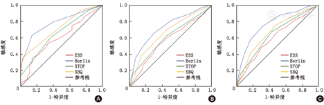 注:ESS:Epworth嗜睡量表;SBQ: STOP-Bang问卷;图A、B、C分别为判断轻-中-重、中-重、重度OSA的结果