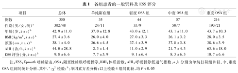 | 项目 | 总体 | 单纯鼾症组 | 轻度OSA组 | 中度OSA组 | 重度OSA组 |
