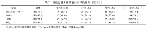 | 量表 | 总体 | 单纯鼾症组 | 轻度OSA | 中度OSA | 重度OSA |