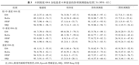 不同程度OSA分组患者4种量表的各项预测指标结果[%(95% CI)]