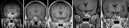 患者女,28岁,因容貌改变5年,闭经1年半入院。患者于2004年2月产后开始出现容貌改变及手脚变粗,2007年6月第2胎产后未恢复月经,在当地医院诊治,予雌激素治疗后有少量月经,症状反复,期间无泌乳等。2009年1月头颅MRI平扫提示垂体腺瘤而到中山大学附属第一医院神经外科住院治疗。发病以来,偶有两颞顶部胀痛,能自行缓解;无明显视力变化,近几年脚增长(鞋由37码增至39码),感手指关节活动不灵活。既往无手术及外伤史,无传染病史,无高血压等病史;末次月经2008年11月;家族成员中无类似病、无遗传相关等疾病。体格检查:体温36.3 ℃、脉博78次/min、呼吸19次/min、血压98/64 mmHg(1 mmHg=0.133 kPa),全身浅表淋巴结无肿大。颈静脉无充盈,甲状腺无肿大。胸廓对称,双肺无干湿性啰音。心率78次/min,律齐,各瓣膜听诊区无病理性杂音。腹平坦,肝脾和双肾正常。肢端肥大症面容:手指脚趾粗大、鼻唇肥厚、颧骨突出、皮肤粗糙等。实验室检查:钾3.78 mmol/L、钠139 mmol/L、钙2.33 mmol/L、磷1.32 mmol/L,促肾上腺皮质激素(ACTH) 4.20 pmol/L、皮质醇(Cortisol) 1.148 μg/L、卵泡刺激素(FSH) 2.45 U/L、黄体生成素(LH) 8.34 U/L、泌乳素(PRL) 42.49 pg/L、雌二醇(E2) 0.003 ng/L、睾酮(T) 0.42 pg/L、孕酮(P) 2.35 pg/L,促甲状腺刺激激素(TSH) 1.446 mIU/L、游离T3 3.898 pmol/L、游离T4 8.401 pmol/L;甲状旁腺素全段(iPTH) 0.016 4 pg/L、甲状腺球蛋白抗体(TG-AB) 2.11 IU/L、甲状腺过氧化物酶抗体(TPO-Ab) 16.27 IU/L,总胆固醇3.6 mmol/L、甘油三酯2.19 mmol/L,OGTT后0、30、60、90及120 min的GH分别为89.1、80.1、67.6、71.3及86.2 μg/L(同期血糖水平分别为5.9、6.7 8.2、7.5和7.1 mmol/L),胰岛素样生长因子(IGF)-1 857 pg/L,糖化血红蛋白(HBA1c) 5.40%。MRI示鞍内及鞍上实性分叶状肿块影,大小约为68 mm×37 mm×35mm,侵犯海绵窦、包绕双颈内动脉并向两侧颞叶生长。由于肿瘤分叶状生长,无论经蝶窦和(或)开颅手术都难以一次手术全切除,先予术前长效生长抑素类似物Lanreotide 40 mg/2周治疗,治疗后再行手术等综合治疗。