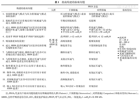 注:PICO:代表每个临床问题的提出应明确说明的人群(Patients)、干预措施(Intervention)、对照措施(Comparison)和临床结局(Outcome);ARDS:急性呼吸窘迫综合征;ICU:重症监护病房;PEEP:呼气末正压;NO:一氧化氮;1 cmH2O=0.098 kPa