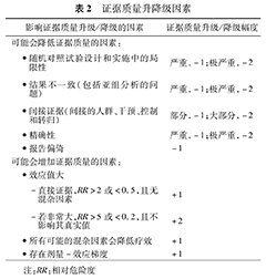 GRADE方法将证据质量分级为"高" 、 "中" 、 "低"和"极低" 4个级别,每个级别的判断主要根据以下8个因素进行详细评价,即研究类型、偏倚风险、一致性、间接性、精确性、发表偏倚、效应值、混杂因素和剂量-效应梯度。一般初始认为RCT为高质量证据,然后根据偏倚风险、一致性、间接性、精确性和发表偏倚情况进行降级处理;设计和实施较好的观察性研究初始认为是低质量证据,但可根据效应值、混杂因素和剂量-效应梯度情况可进行升级处理。证据质量的升/降级处理的具体内容请见表2。在本指南中,针对每个临床问题的整体证据质量的评价请详见证据质量概要表(附录3.1~3.11)。
