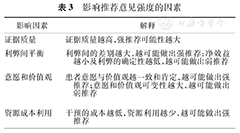 | 意愿和价值观 | 患者意愿与价值观越一致和肯定,越可能做出强推荐;意愿和价值观可变性越大,越可能做出弱推荐 |