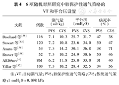 我们共检索出了6项高质量的RCT研究[4,52,53,54,55,56]。Amato等[56]在1998年发表了针对该问题的第1项RCT研究。该研究将53例ARDS患者随机分为对照组(24例:VT=12 ml/kg,调节PEEP维持最佳氧合)和肺保护性通气策略组(29例:VT=6 ml/kg,峰压低于40 cmH2O,PEEP设置于P-V曲线低位拐点之上),结果发现肺保护性通气策略可以显著降低患者的28 d病死率(38%比71%,P<0.001)和气压伤发生率(7%比42%,P=0.020),但未能显著降低住院病死率(45%比71%,P=0.370)。2000年,ARDSnet发表了1项最大规模的多中心RCT研究(ARMA研究)[4]。结果发现,与传统通气策略组(429例:VT=12 ml/kg,平台压<50 cmH2O)相比,小潮气量通气策略(432例:VT=6 ml/kg,平台压<30 cmH2O)能显著降低ARDS患者住院病死率(31.0%比39.8%,P=0.007),减少脏器衰竭的发生和增加28 d无通气辅助时间。2006年,Villar等[52]也证实了肺保护性通气策略能改善ARDS患者病死率。但其他3项RCT研究却未能得出阳性结果[53,54,55],其原因可能与这些研究中两组间潮气量和平台压数值差异较小(表4)、样本例数较少,以及患者的基础状况和对酸中毒的处理方式不同等因素有关。