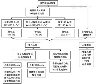 诊断或排除冠状动脉狭窄性病变是行冠状动脉CT成像的主要指征。行冠状动脉CT成像时需对患者相关因素进行评估,选择最优的扫描方案以使用最低的辐射剂量获得能满足诊断的图像质量。应尽量降低患者心率并稳定心律以便使用低辐射剂量的CT扫描方案,建议在无禁忌证的高心率患者使用β受体阻滞剂以降低心率。推荐的辐射剂量优化的冠状动脉CT成像方案如图1。