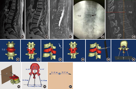 当然,本研究还存在不足和需完善之处。首先,患者术前需要的薄层CT扫描可能会增加放射暴露量,而Mimics软件的熟练操作需要一段时间的学习曲线。其次,术前数字化设计制定的穿刺针外展角术中仍然需要术者根据个人的经验来掌握,有待于进一步设计出配合穿刺针的外展角角度导向器;患者术前CT体位和术中体位的不完全一致也需要1次X线透视明确和微调最终的穿刺点。和其他包括导航在内的辅助技术一样,实际手术无法完全和数字化设计完全吻合。再者,本研究尚处于初步探索阶段,纳入病例较少且都是单椎体骨折病例,缺乏和传统穿刺方法的科学对比。最后,这种新技术的可行性和有效性需要进一步的前瞻性随机对照研究来证实其优点和缺点,以达到临床推广的目的。