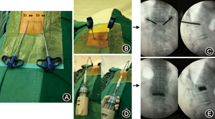 患者取俯卧位,双手固定置于头两侧,皮肤严格消毒,铺无菌手术巾(图4)。选取术前设计的皮肤穿刺点(图3,图4),C型臂X线机透视微调及最终确定穿刺部位,经皮逐层麻醉穿刺通道(2%利多卡因+罗哌卡因),骨外膜要麻醉充分,穿刺点皮肤切开约3 mm小孔,骨水泥混合和注射设备为美国Stryker公司的经皮骨水泥传送系统(PCD),双人同时操作用骨穿针对准T12椎弓根,在外科锤连续轻击下,骨穿针自外上方向内下方进针(进针外展角参照术前设计约15°左右,当针尖进入椎体后,可连续进针,在术中X线透视帮助下置针尖与椎体前中1/3交界处,保留针管,退出针芯。调制骨水泥(SPINEPLEX,Stryker)后置入Stryker公司的PCD系统,旋转螺旋推进器,将骨水泥挤入针筒内,从针筒出口处检查骨水泥的性状,约2 min骨水泥呈牙膏状时,将针筒出口分别与左右侧骨穿针基底部连接,借助螺旋推进器推动骨水泥入T12椎体内(螺旋推进器有刻度,推送1圈0.4 ml,左右各5圈,1节椎体共打入骨水泥4 ml。注射完毕后将针芯插回针管,并旋转拔出骨穿针。可吸收线缝合伤口(图4)。