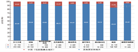 1.近年来我国呼吸系统疾病的防治任务不但没有减轻,反而更重。《2013中国卫生统计年鉴》关于我国2012年城市和农村居民前10位主要疾病死亡率及死因构成的统计数字显示,呼吸系统疾病(不包括肺结核、肺癌和肺源性心脏病)在城市人口死因中排第4位(12.32%),死亡率为76/10万,在农村也排第4位(15.75%),死亡率为104/10万[4]。